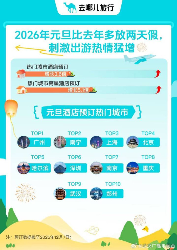 去哪儿旅行大数据显示,截至2025年目前,2026年1月1日—3日入住热门城市酒店订单量同比增3倍以上。酒店预订量最高的10个城市分别是广州、南宁、上海、北京、哈尔滨、深圳、南京、重庆、武汉、郑州。与此同时,部分热门城市高星酒店的性价比优势更加凸显,订单量同比增5倍。